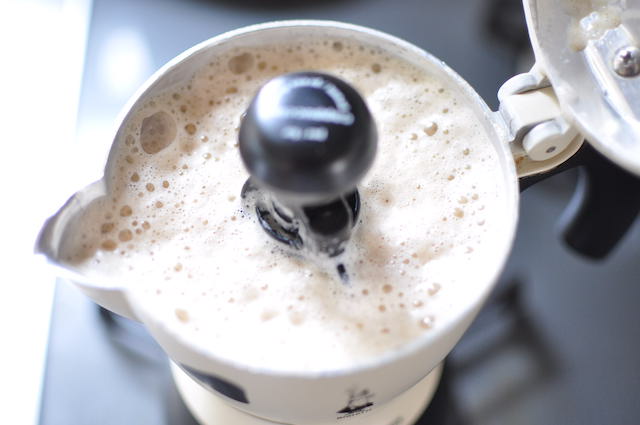 準備できたムッカエクスプレスをコンロの火にかけて、1〜2分立つとバルブが上がりエスプレッソが吹き上がり、牛乳があわだてられてカプチーノが出来上がります。