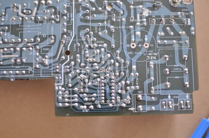 電源基板のコンデンサ交換と同じ要領で作業していきますが、うまく半田が溶けてくれないものも出てきました。