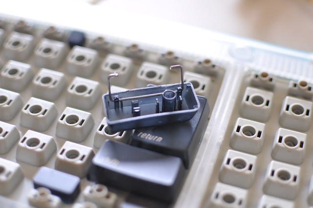 リターンキー×2、スペースキー、シフトキー×2には金具がついているので、こちらは後回しにして他のキーを先に外していきます。
