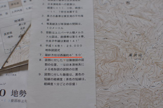 地図にはその地域の偏差が記されています。この偏差角度の線を地図に書き込みます。