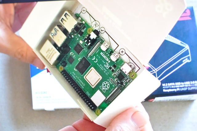 マイクロSDカードを使う場合は、ラズパイにSDカードを差し込み、M.2_SSDをケース下部にセット。これを合体させます。