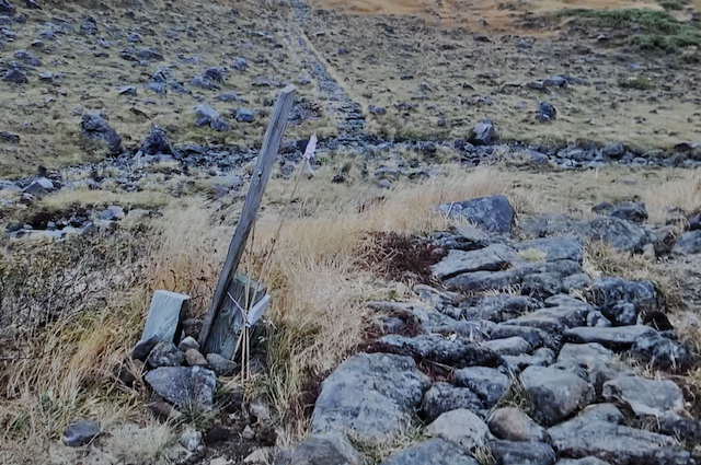 このあと、下降中に日は暮れ、霧雨の中をヘッドライトで避難小屋に向かい、唐獅子平の道標を見つけましたが、道標からでも避難小屋はみえません。