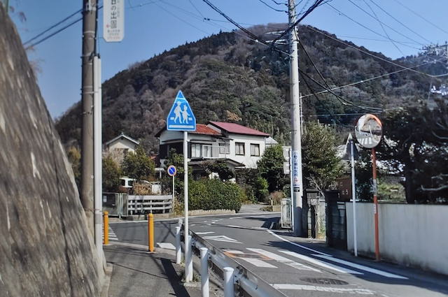 まっすぐな道を進むと、三叉路に突き当たります。ここを右のほうに進み、先の川久保交差点を渡り、先に続く住宅街の道を進み、何の表示もないところを右折、森戸川に沿った道を進むと林道ゲートへたどりつきます。