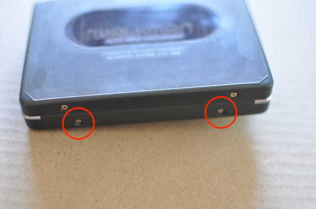 ウォークマン裏側を押さえているビスのみ外します。すなわち本体底面の2本、上面の2本、左側面の一本です。