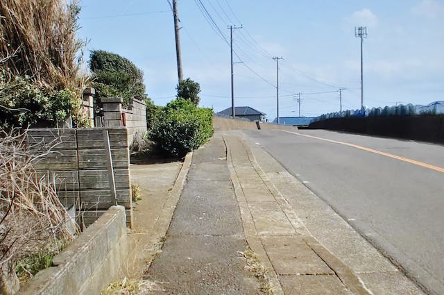 国道沿いは歩道のないところもあります。気をつけながらこれを進んで、「朝市」の看板のある道路を挟んで反対側、塀に挟まれた道を登っていきます。スマートフォンの地図アプリのナビゲーションに従っています。