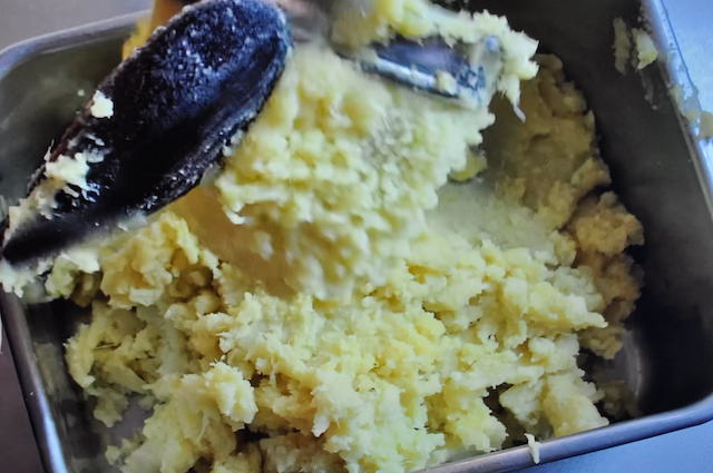 茹で上げたさつまいもを熱いうちに裏ごししていきます。