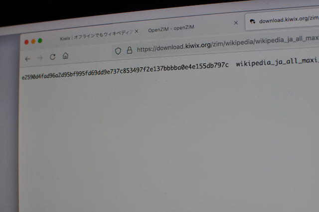 前述させたいただきましたZIMファイルのダウンロードリンクページで、個々のコンテンツダウンロードリンクをクリックすると、SHA256の係数が示されます。